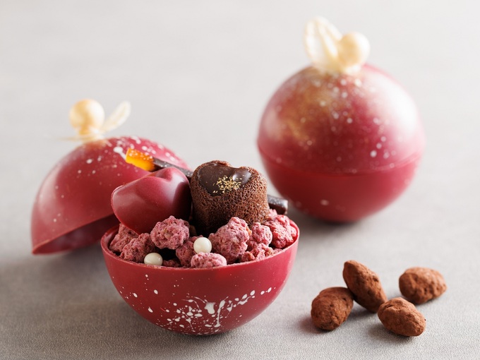 天使の羽と真珠をあしらった真紅の球体チョコレートは、プリンセスの宝石箱をイメージ。