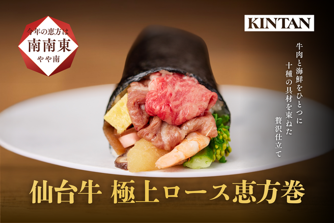 2026年2月3日(火)の節分に向けて、『焼肉KINTAN』で予約受付を開始した恵方巻を紹介しました。 100本限定の「和牛とろたく」や、仙台牛を使用した豪華な恵方巻は、今年の恵方「南南東」を向いて食べるのにぴったりです。