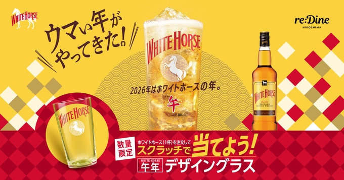 2026年2月2日(月)〜2月下旬までの期間限定!広島市中心部の「基町クレド・パセーラ」6階にある『reDine(リダイン)広島』にて、2026年の幕開けを祝う「ホワイトホース スクラッチで当てよう!午年デザイングラス」キャンペーンが始まります。