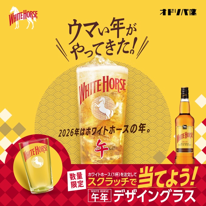 2026年の干支・午(うま)にちなんだスコッチウイスキー「ホワイトホース ハイボール」を注文すると、なんとその場で当たりがわかるスクラッチに挑戦できちゃいます!