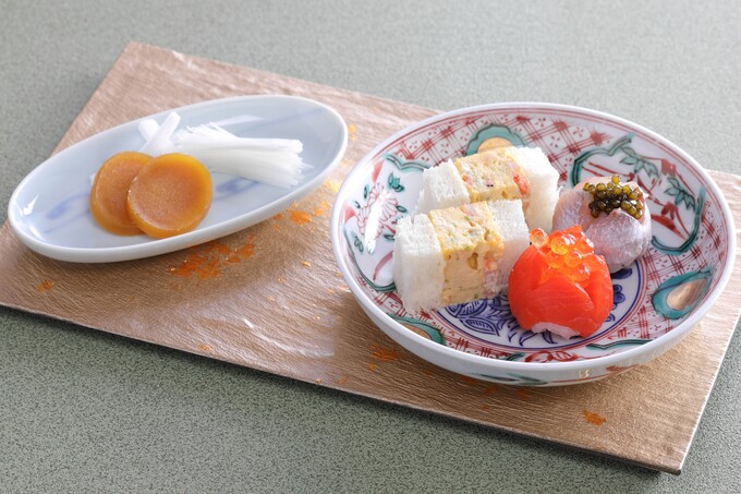 「桜海老の出汁巻きサンド」や「小鯛昆布〆手毬寿司 キャビア添え」など、料理長が丁寧に仕上げる本格的な和食を少しずつ味わえます。