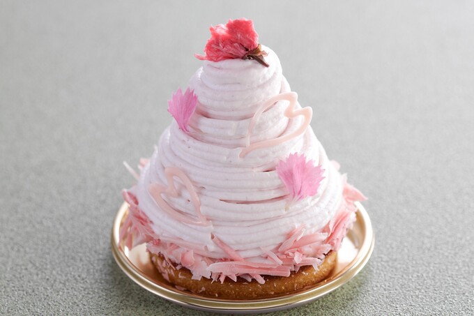 「桜モンブラン」は、チェリーを入れたアーモンド生地に桜ムースをのせ、桜風味のいちごクリームを絞ったひと品。