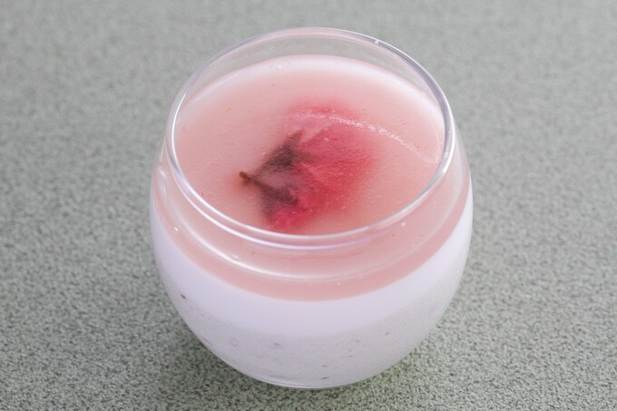 小倉あんのムース、桜のブラン・マンジェ、いちごのジュレが層になっており、日本茶ともよく合います。