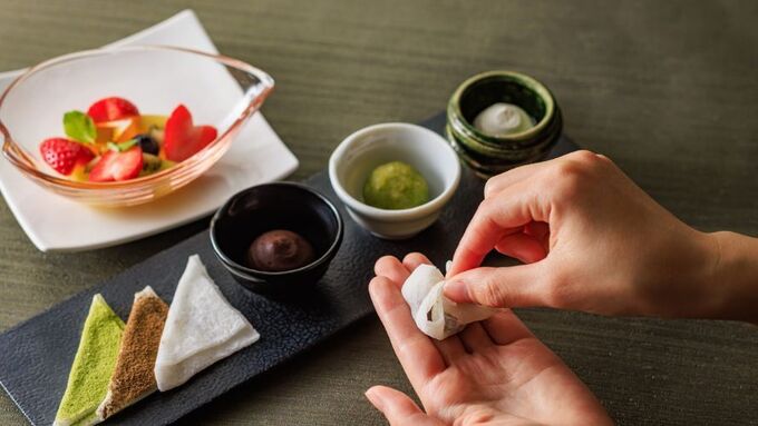 おかわり自由のぎゅうひに、餡やフルーツ、抹茶クリームなどを包んで味わう体験型プレートです。