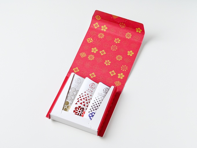 ギフト箱は3本入、5本入の2種類を展開し、着物の襟元に忍ばせる「筥迫(はこせこ)」をイメージしたデザインを採用したひと品です。