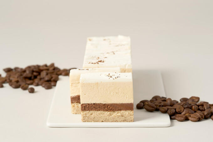 一番下の層は、ホワイトチョコレートのコクのある甘味を感じるなめらかな生ガトーショコラ。コーヒー粉を混ぜ、さらに上部にエスプレッソを塗ることで、余韻にコーヒーの香りが長く続きます。