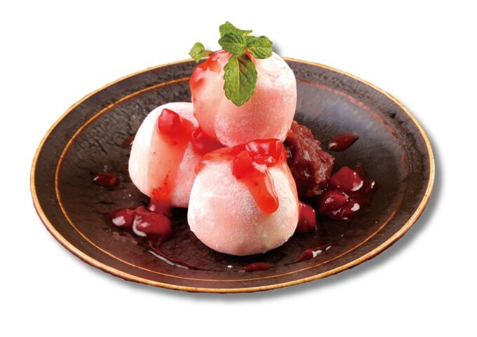 ひんやりとしたバニラアイスをもちもち食感の求肥で包み、甘酸っぱいイチゴを合わせた見た目にも華やかなひと品です。