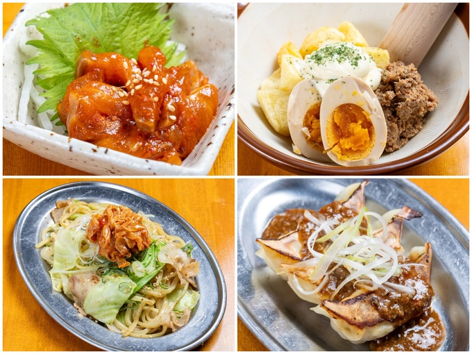 「サーモンの生キムチ」や「馬刺しユッケ」といった肉刺し・前菜から始まり、「麻婆餃子」や「タルタル唐揚げ」などのお酒が進むメニューが勢揃いしています。