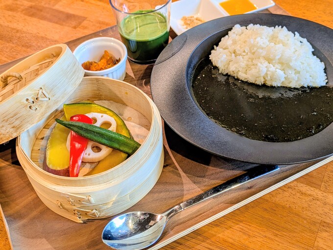 見た目の鮮やかさと、厳選された素材が織りなす「せいろ蒸し野菜カレー(竹炭ブラック)」を紹介しました。