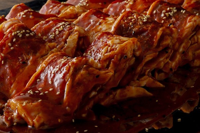 ディナー限定の「厚切り上カルビ」は、食べ応え抜群なひと品。オリジナルの辛みそダレが肉の旨みをさらに引き立てます。