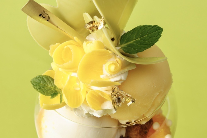 「ミモザ」は、日向夏やグレープフルーツ、マンダリンオレンジといった柑橘の爽やかな酸味に、ミルキーなホワイトチョコクリームの優しい甘さを合わせたパフェ。