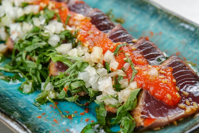 「藁焼き鰹のカルパッチョ」は、フレッシュトマトのバジルソースをたっぷりとかけた、見た目も華やかなひと皿。