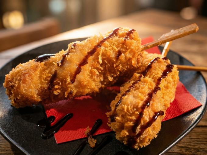 サクサクに揚げた軽やかな衣が特徴の「豚ロースの串カツ」。ひと口頬張れば豚ロースのジューシーな旨みが広がります。