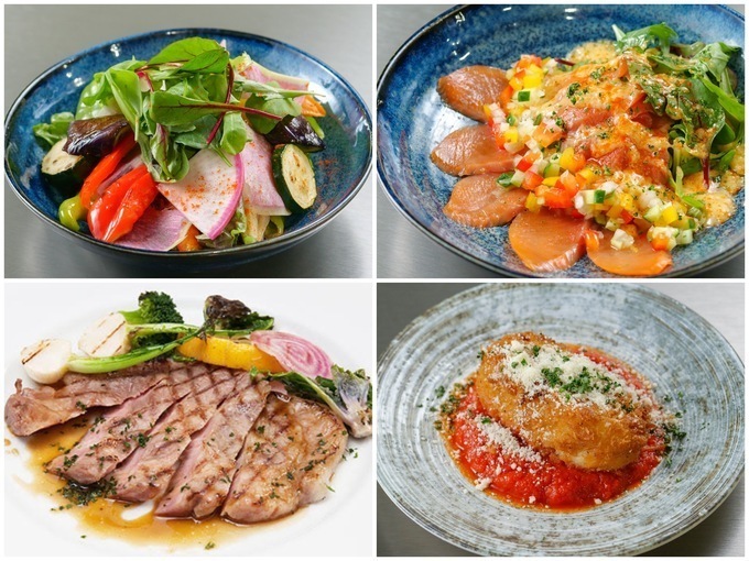 創作洋食『N's TOKYO 極』。神奈川県三浦市から届く朝採れの「三浦野菜」を使用したサラダや、クリーミーな「ズワイガニのクリームコロッケ」、香ばしく焼き上げた「国産豚肩ロースのグリル」など、素材にこだわった逸品料理が味わえます。
