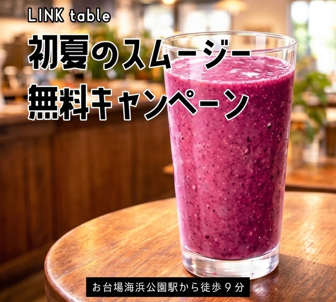 『LINK table』で実施される「初夏のスムージー無料キャンペーン」を紹介しました。