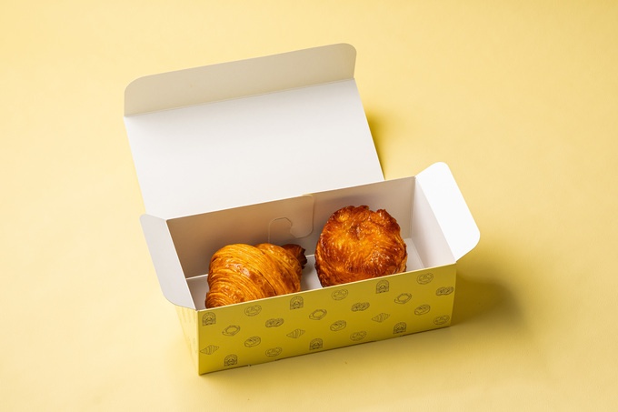 「リアルパリクロワッサン」と「焦がしバターのクイニーアマン」が1個ずつ入り、さらに次回使える「クロワッサン1個無料券」がセットになったお得なボックス。