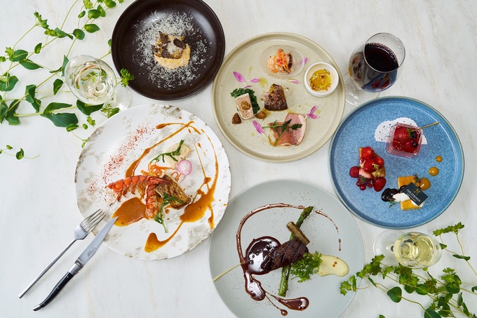 「Anniversary Plan」では、魚介のサラダや牛サーロインのポワレなど、目にも鮮やかなフレンチのコースに豊富なフリーフローを用意しています。