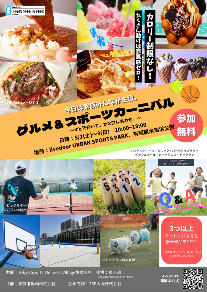 2026年5月2日(土)・3日(日)の2日間限定!入場無料のイベント『グルメ&スポーツカーニバル』が、有明テニスの森駅から徒歩3分「livedoor URBAN SPORTS PARK」で開催。会場には、無料で楽しめるスポーツ体験コンテンツや、多彩なキッチンカー登場!親子はもちろん、友人同士でも思い切り楽しめるイベントになっています。家族で思い切り体を動かして、GWの思い出を作りませんか?
