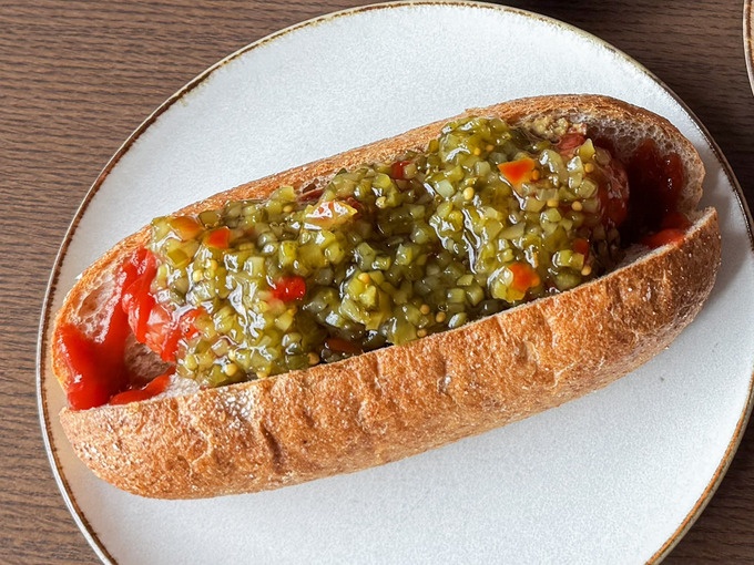たっぷりピクルスが主役!「贅沢ピクルスのレリッシュドッグ」