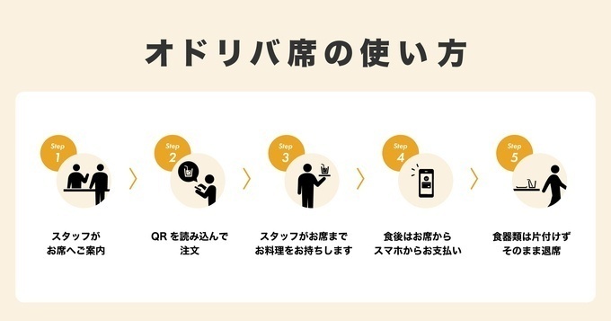これらのお店は共通の客席エリア「オドリバ席」から、モバイルオーダーを利用することで席を移動することなく7つの専門店をハシゴするように楽しめます。