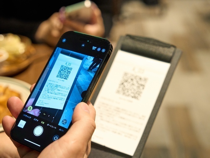 オドリバ席に着いたら、まずはテーブルのQRコードをスマホでスキャン。モバイルオーダー&決済なので、わざわざ各店舗のレジに並んだり、お財布を出したりする必要はありません。