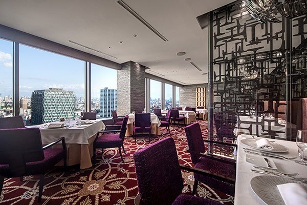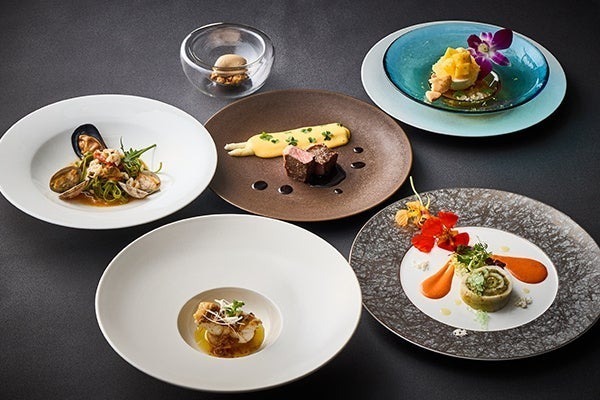 地上100mから見渡すパノラマビューとともに、穴子や白海老、宮崎マンゴーといった旬の素材を、伊仏融合の洗練された一皿で堪能できます。