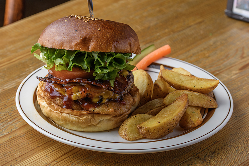 カリカリのベーコン、濃厚なチェダーチーズ、サクサクのオニオンリングに、自家製のBBQソースがたっぷりとかかった、アメリカ西部の味を再現した一品です。