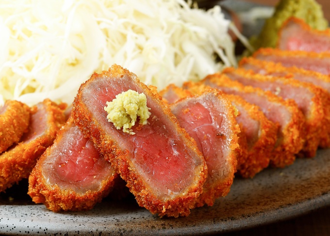 京都発、誰もが惚れ込む絶品牛カツ。京都勝牛が提案するのは、肉の旨みにこだわった厳選部位にキメ細やかな衣を薄くまとわせ、わさび醤油で食す「和の牛カツ」。牛肉だからこそできる「中はミディアムレア、外はサクサク」の牛カツはまさに絶品です(写真:牛ロースカツ京玉膳)。
